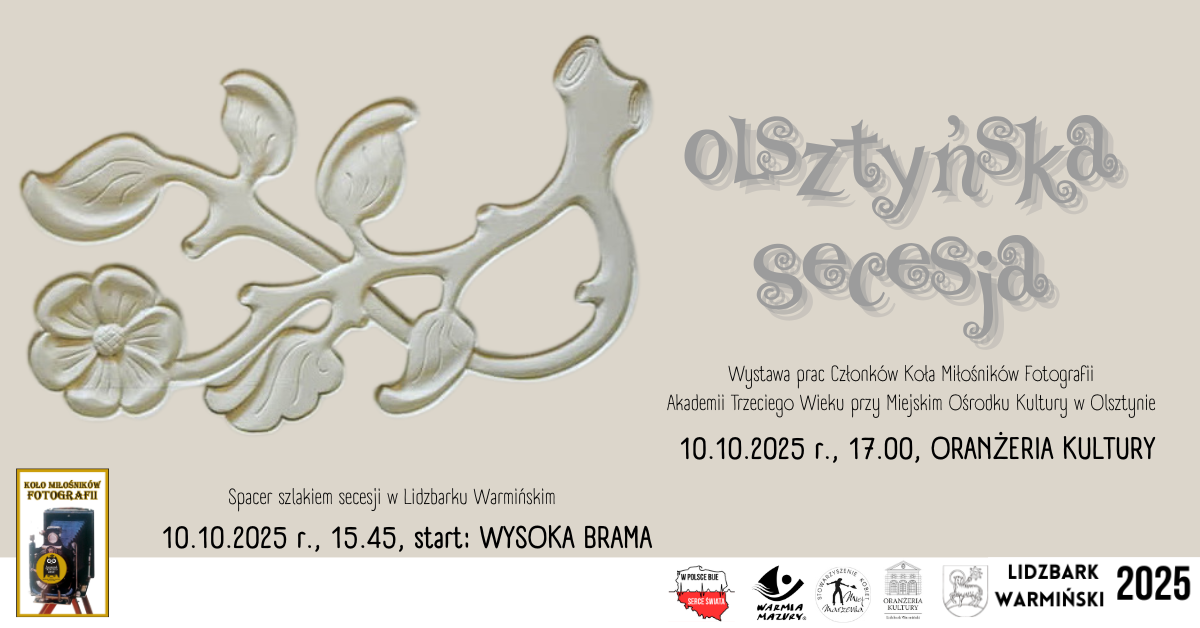Wystawa OLSZTYŃSKA SECESJA to prace członków Koła Miłośników Fotografii Akademii Trzeciego Wieku przy Miejskim Ośrodku Kultury w Olsztynie. Są one plonem warsztatów fotograficznych dotyczących sztuki fotografowanie budowli zabytkowych i poszerzanie wiedzy o secesji w sztuce.