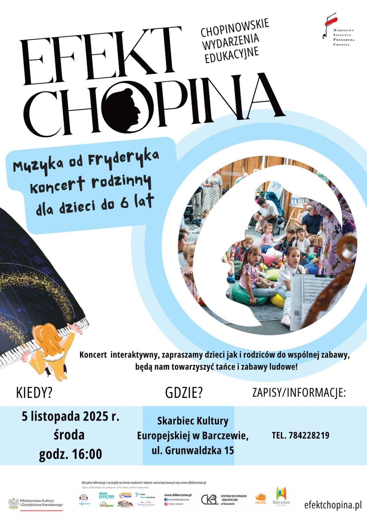 Miło nam poinformować, iż zakwalifikowaliśmy się do ogólnopolskiego programu „Efekt Chopina” realizowanego przez Narodowy Instytut Fryderyka Chopina. Serdecznie zapraszamy do Skarbca Kultury Europejskiej na Rodzinny Koncert „ Muzyka od Fryderyka:. Wydarzenie skierowane jest głównie do dzieci w wieku 3-6 lat ale zapraszamy wszystkich. Podczas koncertu dzieci poznają bogactwo i wirtuozerię utworów fortepianowych Chopina. Utwory dobrane są adekwatnie do wieku i percepcji dzieci. Koncert ma charakter interaktywny, zarówno dzieci jak i rodzice będą zapraszani do wspólnej zabawy, tym razem będą nam towarzyszyć tańce i zabawy ludowe. Zapisy i informacje: tel: 784 288 219